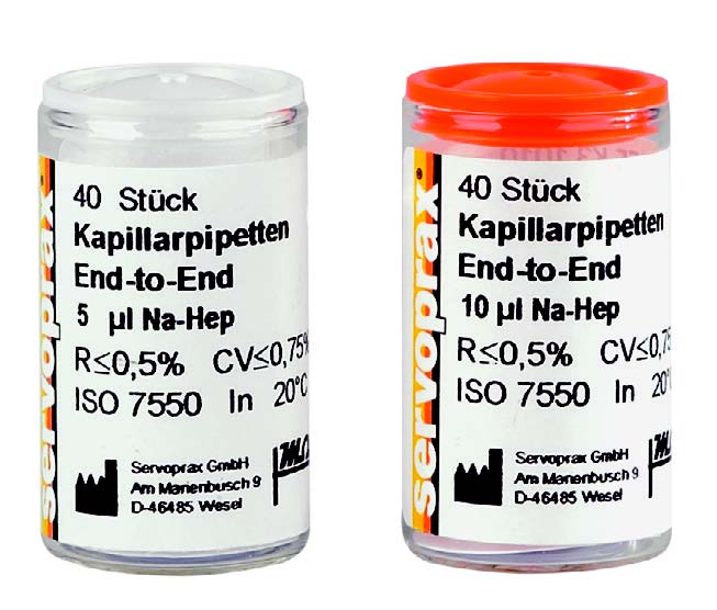End-to-end Kapillarpipetten, heparinisiert, Dose à 40 Stück mit 5 μl