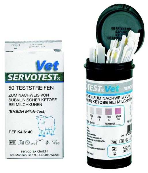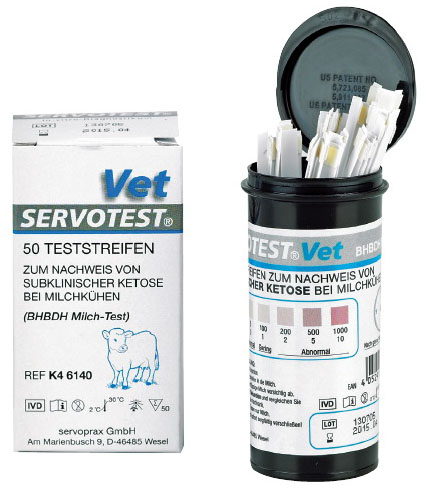 Zum Nachweis von subklinischer Ketose bei Milchkühen Die SERVOTEST® VET Teststreifen sind visuell ablesbare Eintauch-Teststreifen. Verwenden Sie den Test nur für das Testen von Milch. Der SERVOTEST® VET Test ist ein semiquantitativer, farbmetrischer Test, der die Konzentration von ß-Hydroxybutyrate in der Milch misst. Dieser Test ist ein sinnvolles Diagnose Hilfsmittel, um bei einzelnen Kühen eine erhöhte Keton Konzentration festzustellen, welche auf eine Überlastung des Tieres hinweist.